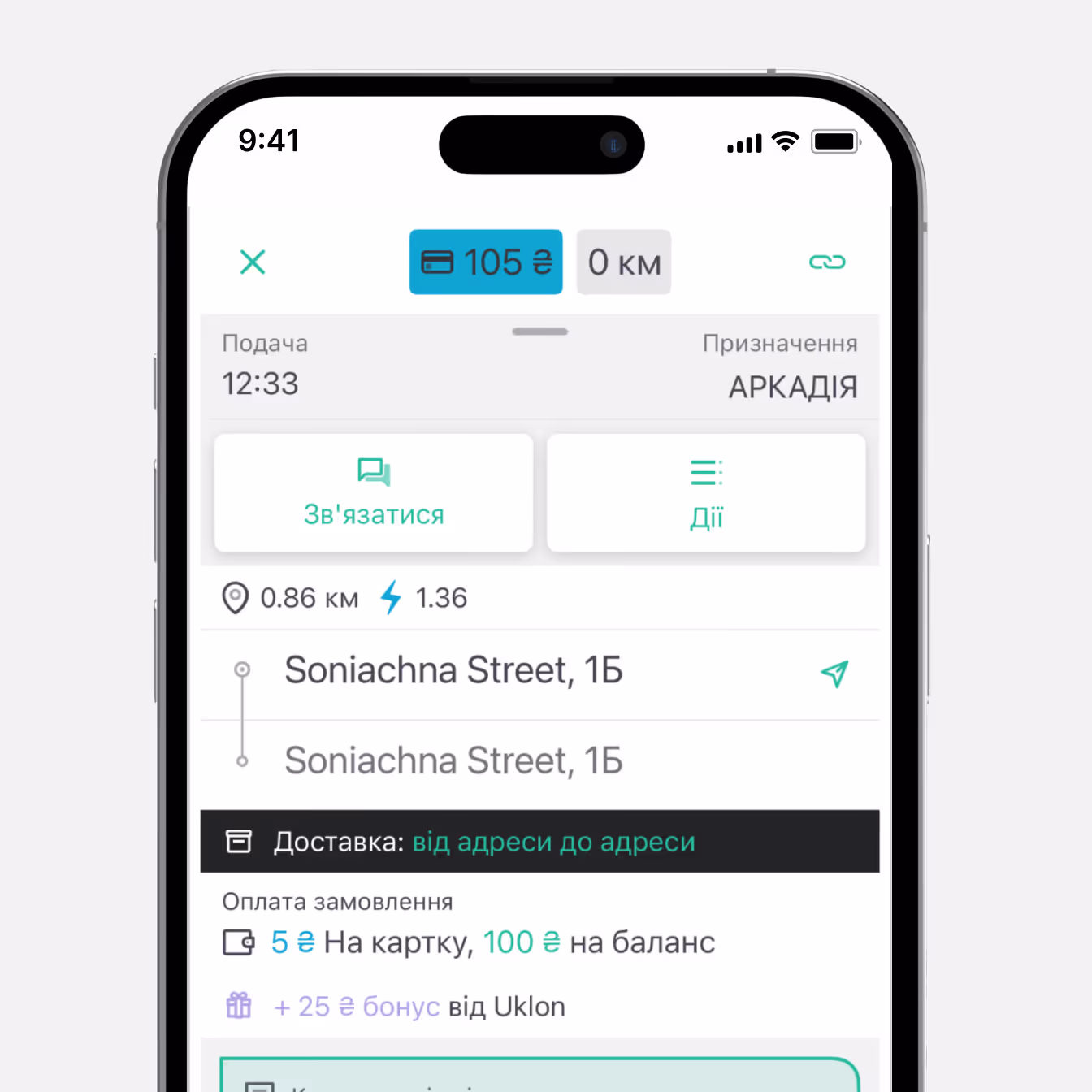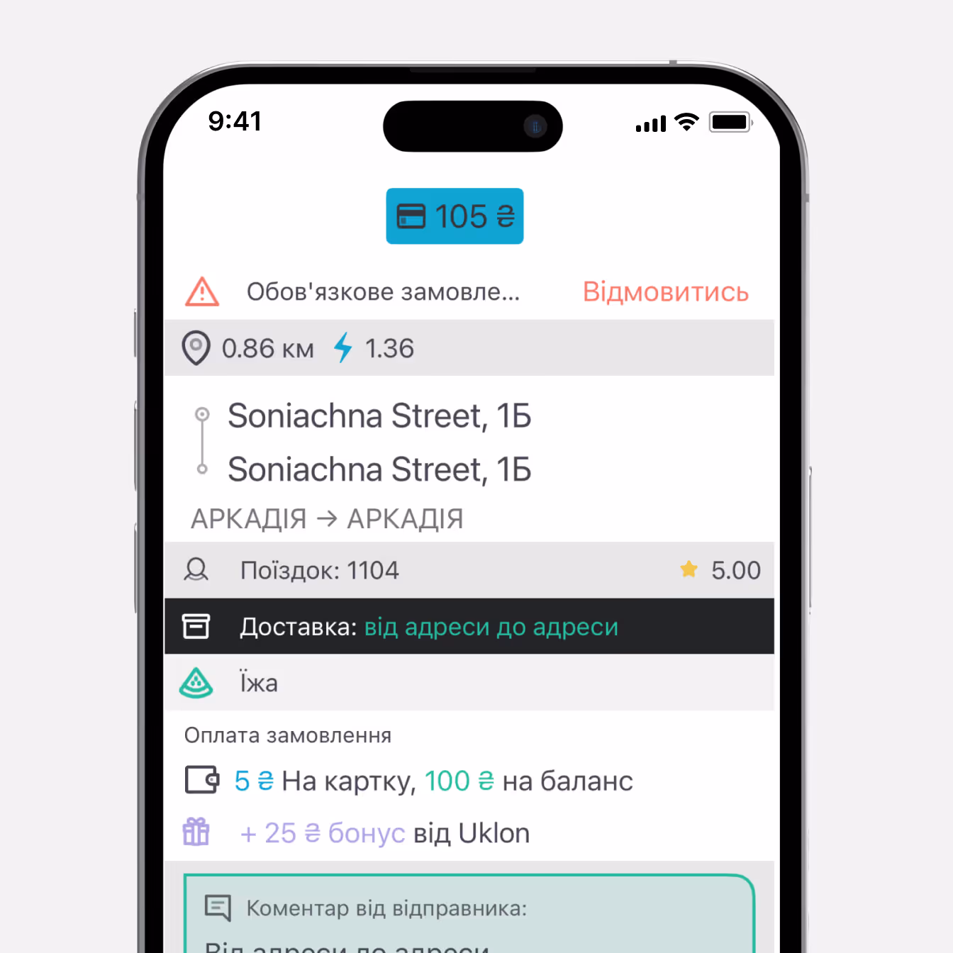 Uklon Delivery це сервіс компанії Uklon для кур'єрської доставки, який дозволяє швидко і зручно відправляти посилки, документи чи товари «від дверей до дверей». Необхідно було полегшити флоу для водіїв в розрізі доставки. Важливо враховувати контекст, в якому перебувають водії: більше уваги йде на дорогу, неможливість сильно вглядатись під час поїздки, користування однією рукою.